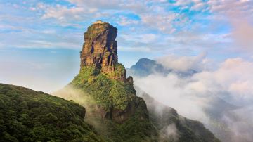梵净山位于贵州省东北部的铜仁地区,海拔2572米,系武陵山脉主峰、联合国“人与生物圈”保护网成员、世界自然遗产、国家5A级旅游景区。总面积567平方公里。原始洪荒是梵净山的景观特征,全境山势雄伟、层峦叠嶂,溪流纵横、飞瀑悬泻。其标志性景点有:红云金顶、月镜山、万米睡佛、蘑菇石、万卷经书、九龙池、凤凰山等。